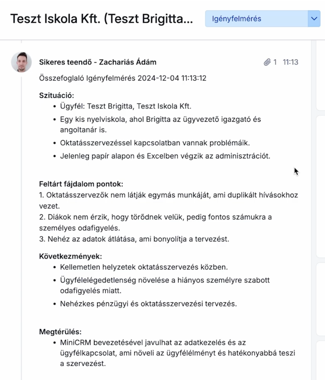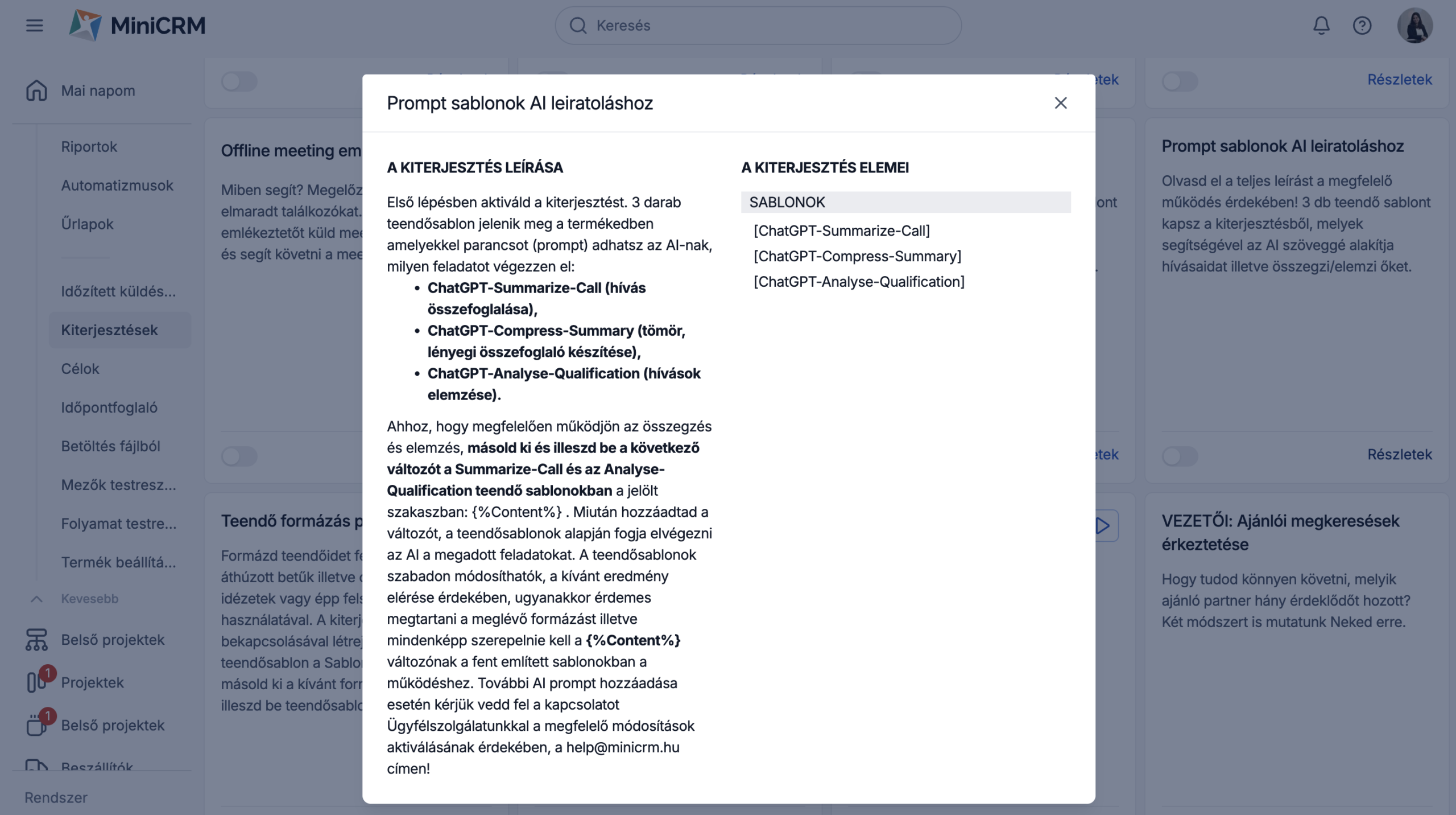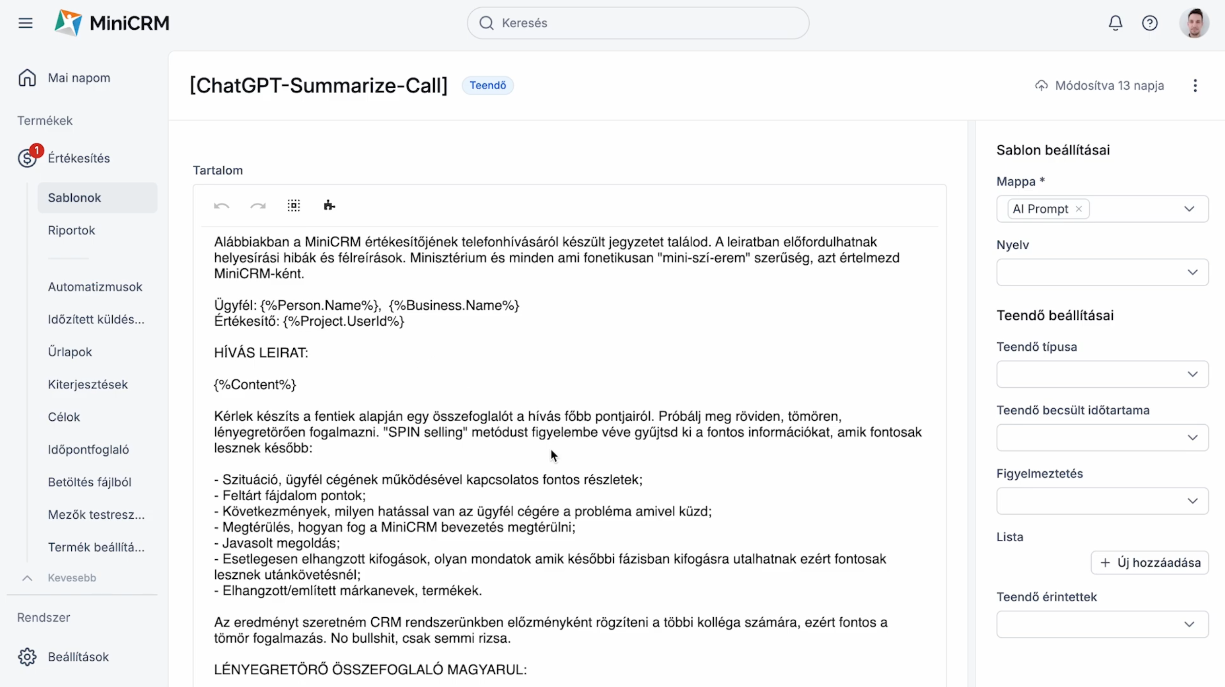 A kívánt eredmény eléréséhez kollégáink az igények alapján személyre szabott teendő sablonokat biztosítanak ügyfeleinknek, amelyek promptként (parancsként) meghatározzák az AI számára az elvégzendő feladatot. Ezek a teendő sablonok a későbbiekben egyénileg szerkeszthetők a legtökéletesebb eredmény érdekében. Az AI a meghatározott teendő sablonok alapján elvégzik a feladatot és az eredményt megjelenítik a MiniCRM-ben.