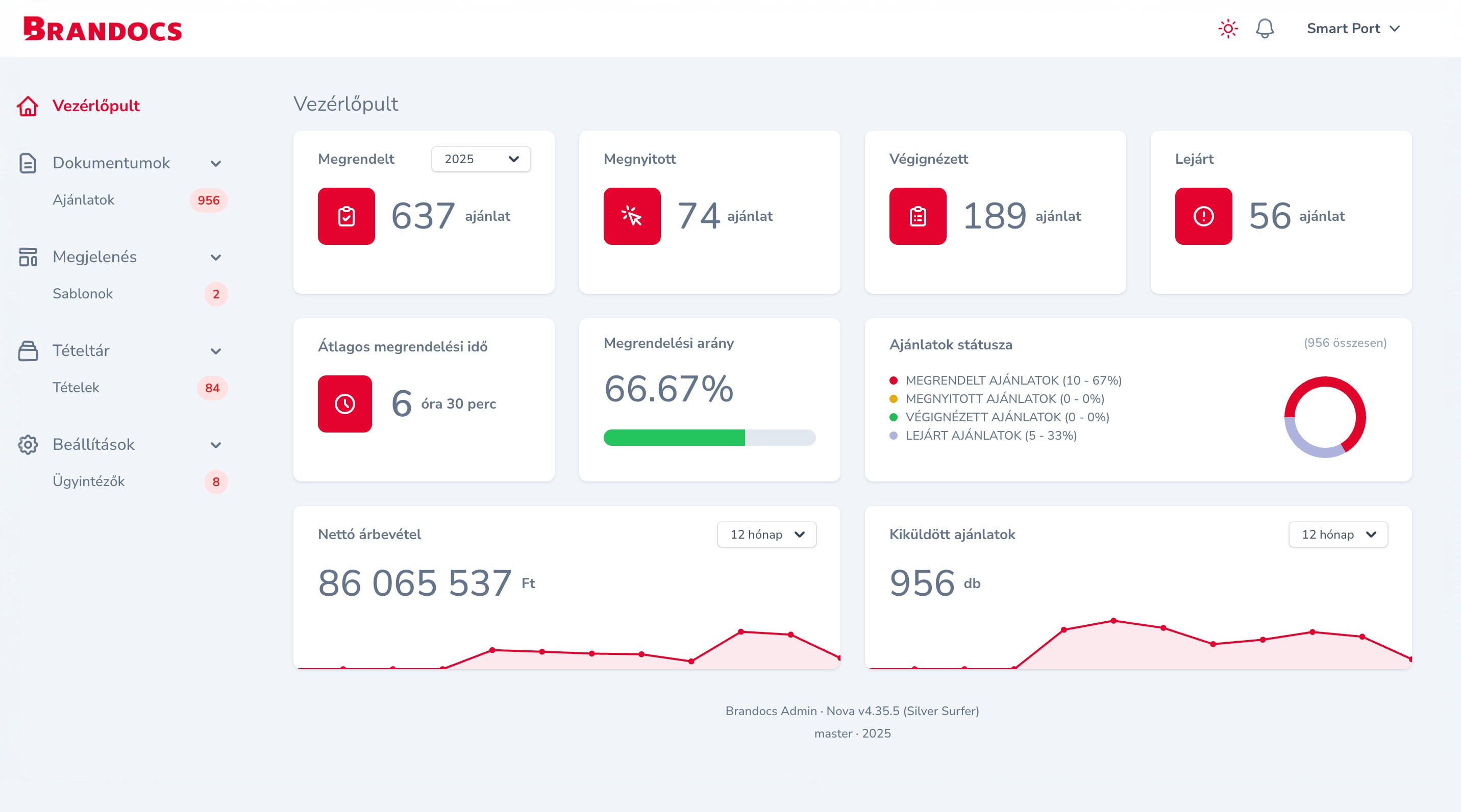 A Brandocs előfizetésed hozzáférést biztosít egy egyéni vezérlőpulthoz, ahol részletes statisztikákat találsz kiküldött ajánlataidról, testreszabhatod ajánlati sablonjaidat, feltöltheted a készleten lévő termékeidhez, szolgáltatásaidhoz kapcsolódó képeket, videókat, ismertetőket és további beállításokkal teheted gördülékennyé az ajánlatadási folyamatod működését: