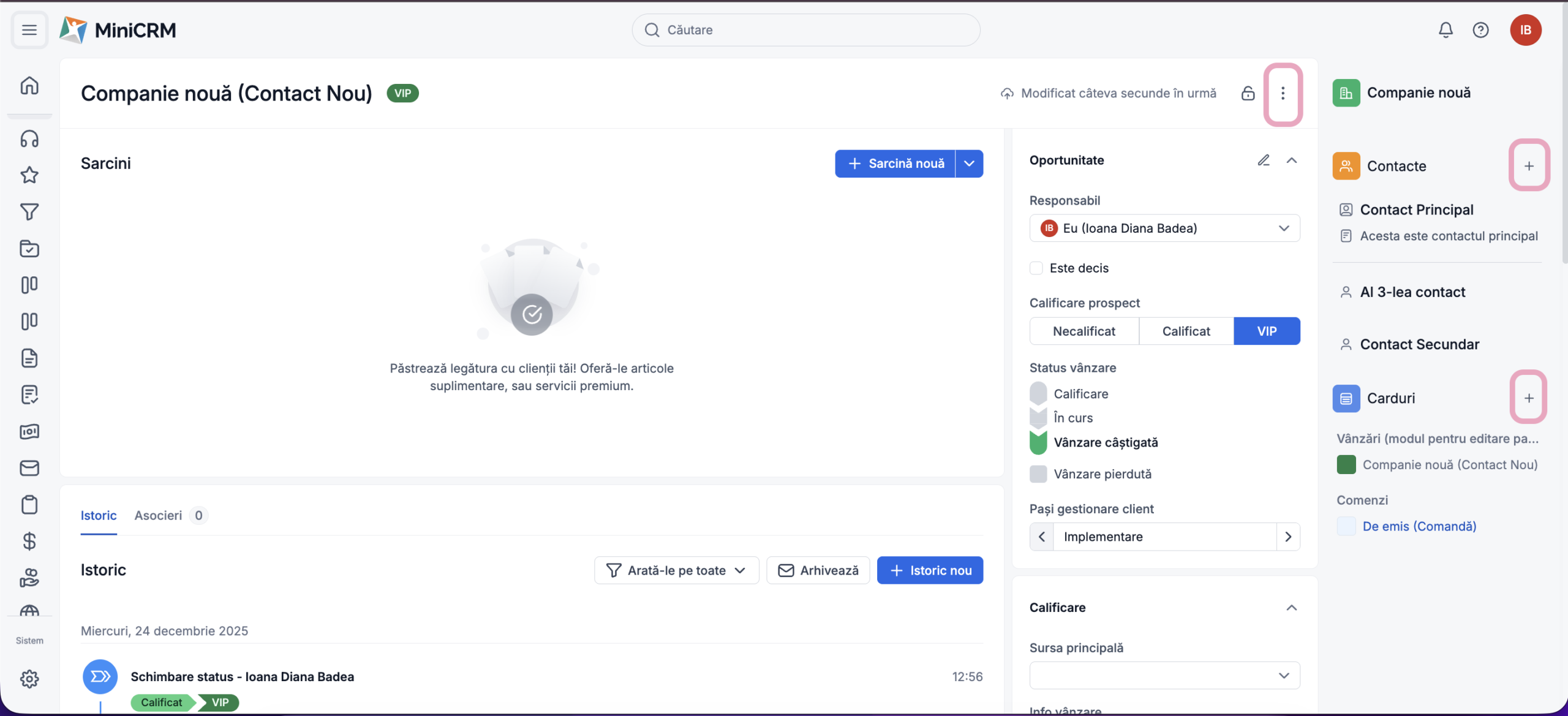 În partea din stânga a paginii sunt secțiunile Sarcini și Istoric. Acestea te ajută să îți gestionezi eficient clienții.