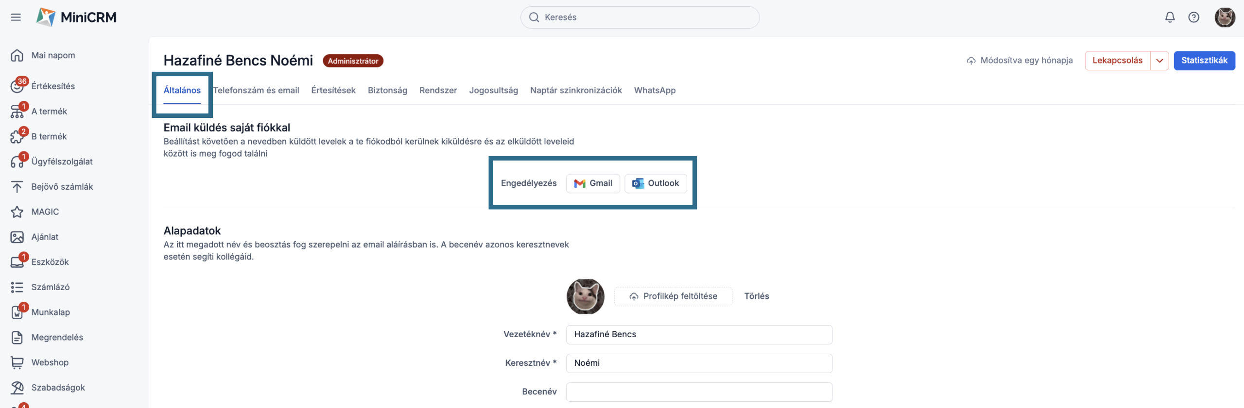 Az összeköttetés során választhatod a MiniCRM felhasználódhoz tartozó email címet (amellyel bejelentkezel a rendszerbe) vagy a Termék beállítások menüpontban beállított központi vagy egyedi feladók egyikét.