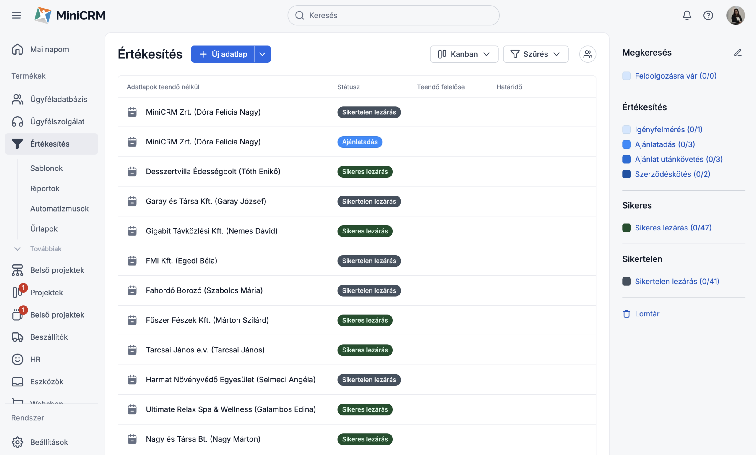 Mivel a MiniCRM erőssége az értékesítés támogatás, ezt a folyamatot nézzük meg egy kicsit alaposabban.