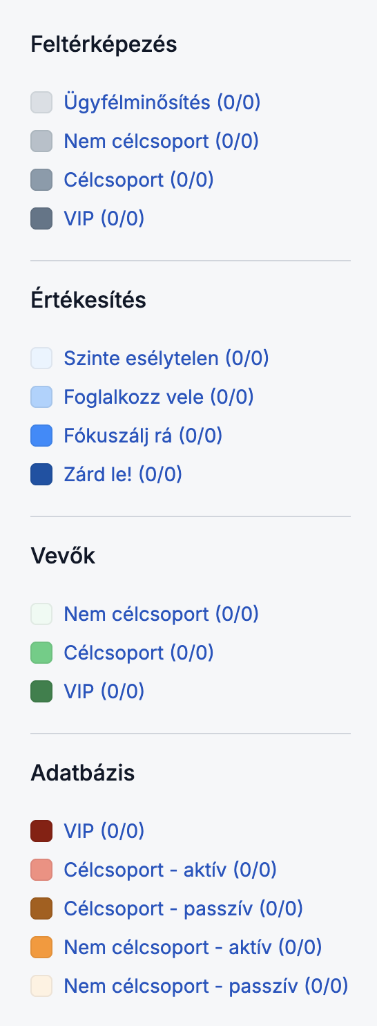 - Az érdeklődőket egyszerűen és átláthatóan minősítheted a termék által kínált három kategória alapján (Nem célcsoport, Célcsoport, VIP).