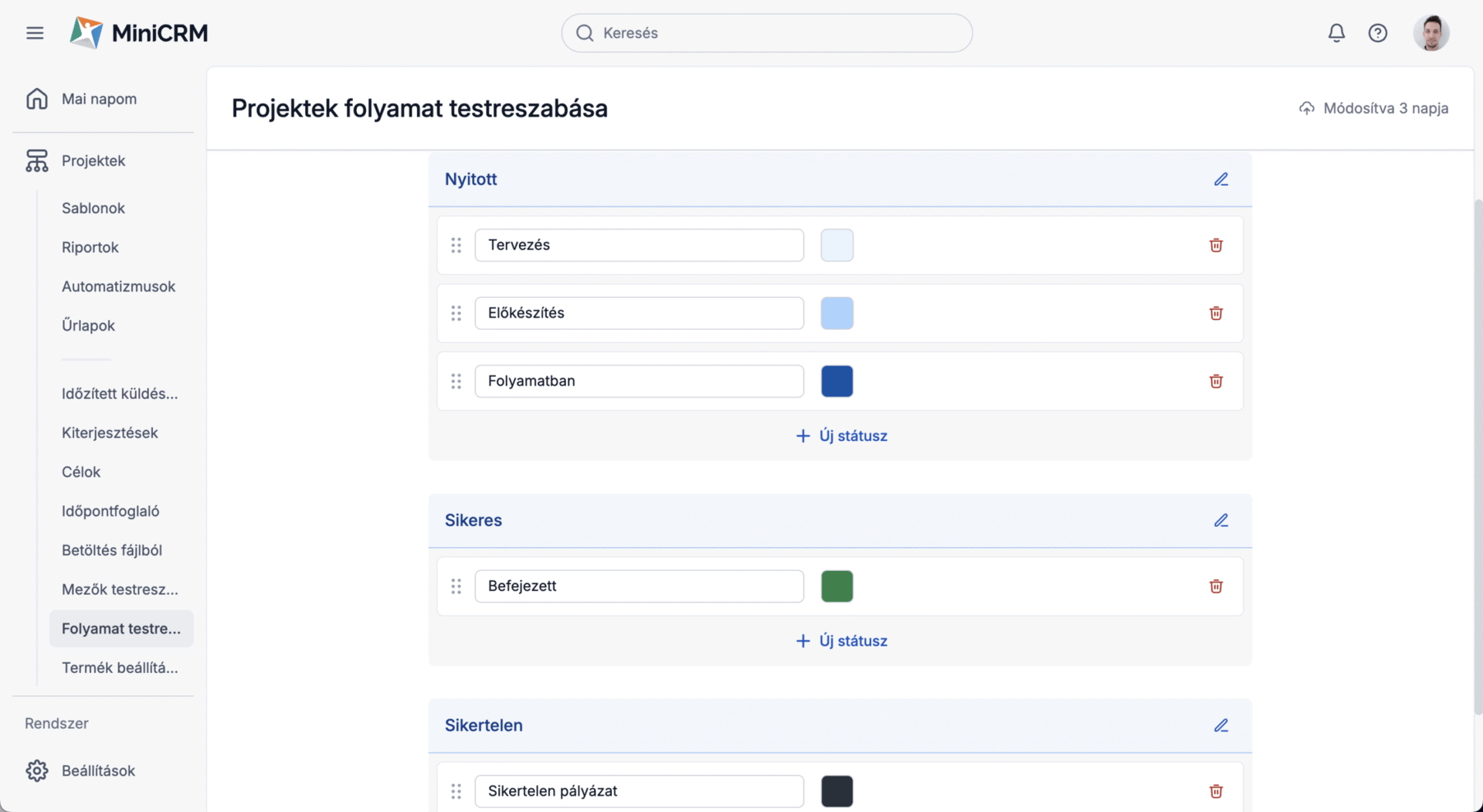 A fenti fotón látható ceruzára kattintva eljutsz a státusszerkesztőhöz, ahol tetszés szerint létrehozhatod az adott termékhez, folyamathoz legjobban illő státuszokat.