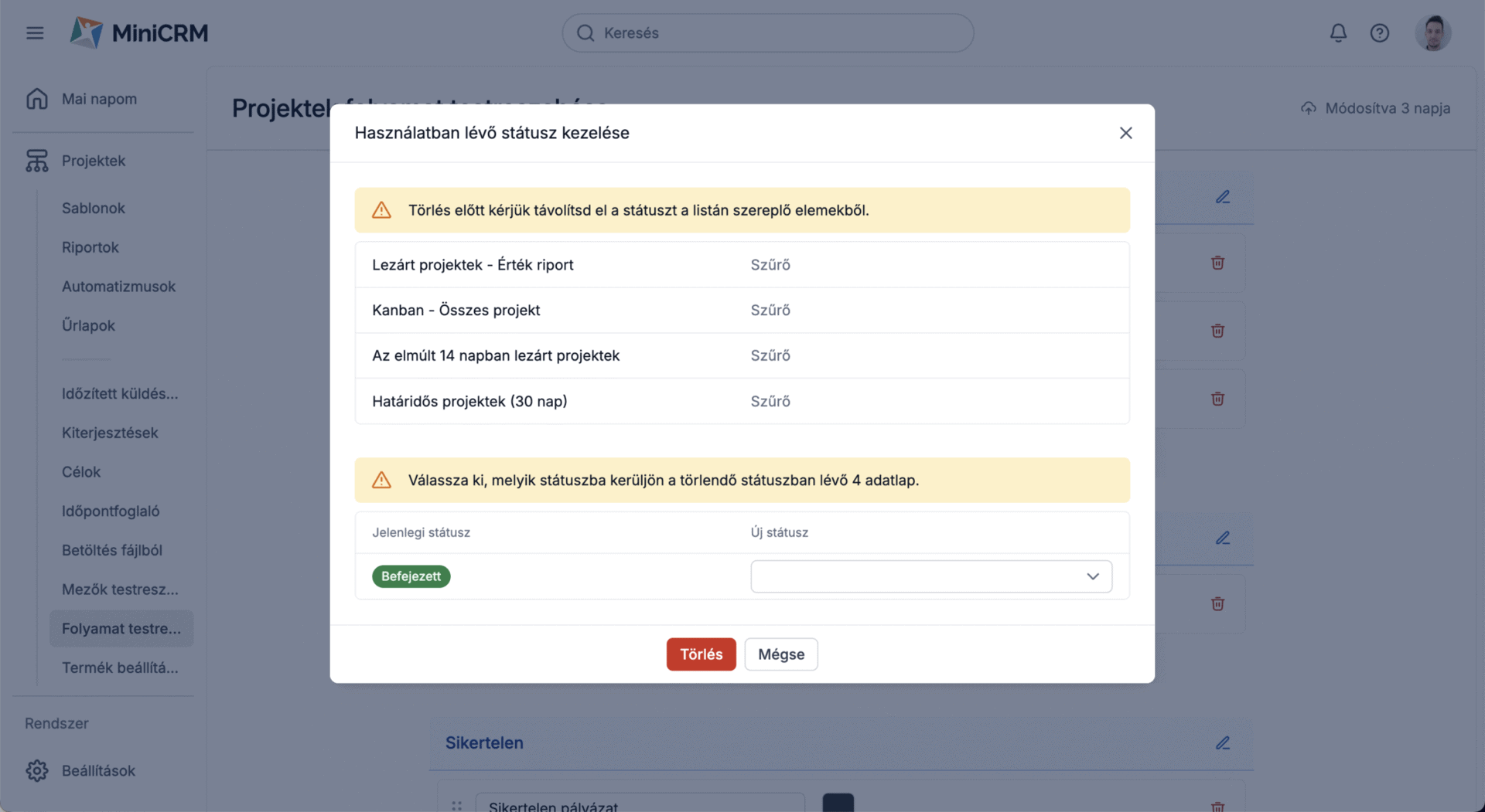 Amennyiben egy státuszt törölni szeretnél, de azt használjátok valamilyen szűrőben, automatizmusban, űrlapban, vagy vannak adatlapok az adott státuszban, egy hibaüzenetet fogsz kapni. A törléshez módosítanod kell, vagy meg kell szüntetned minden olyan elemet, ami használja a törölni kívánt státuszt.