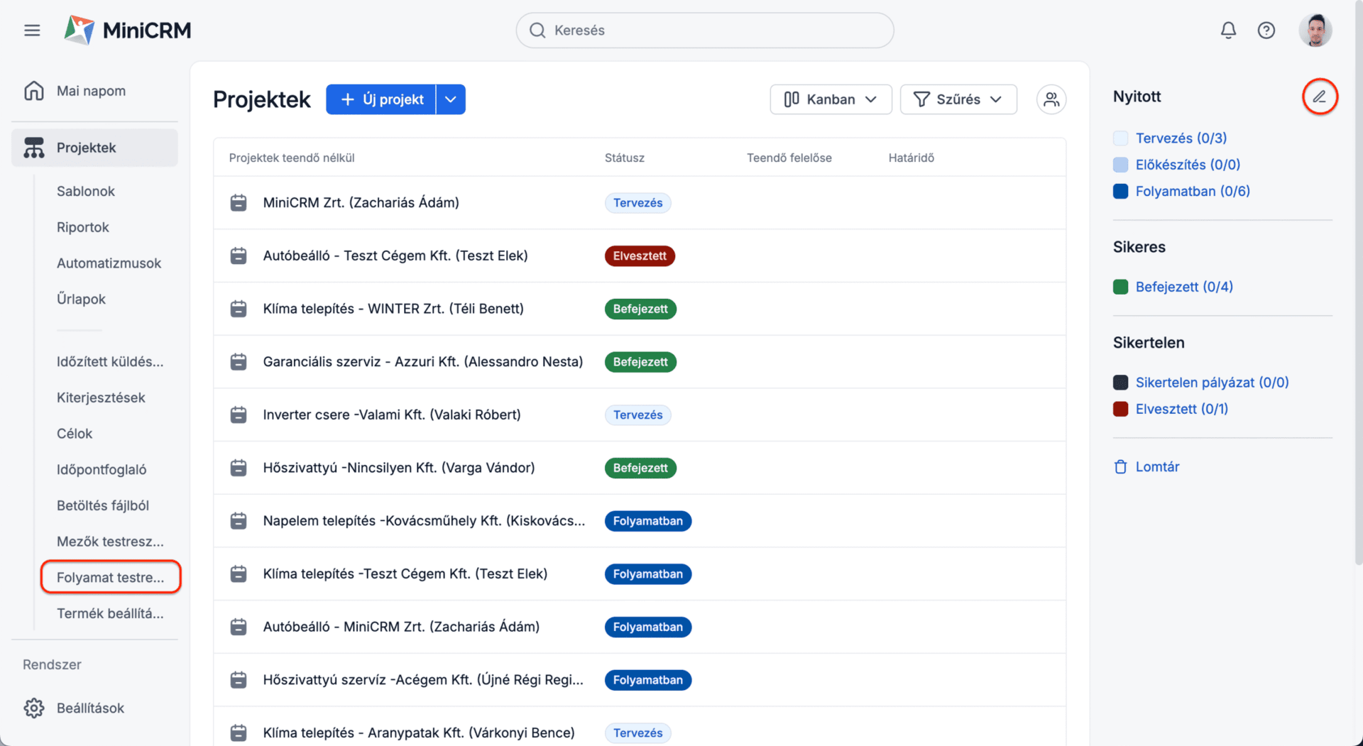 - Sikeresen lezárt – pozitívan végződött folyamat. Az ügyfél szerződött, kifizette a számlát, vagy a projekt véget ért, a termék legyártásra került.